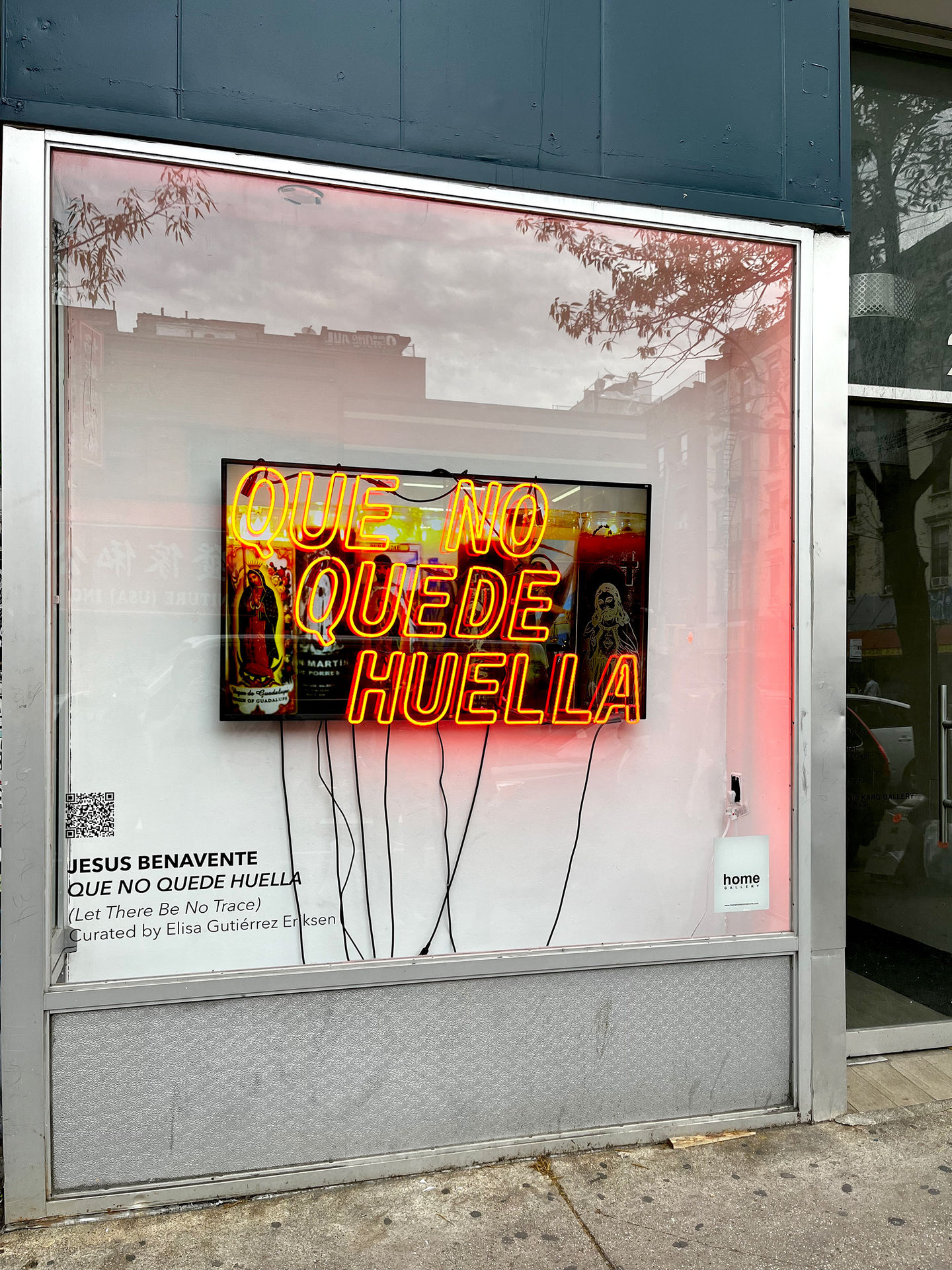 Que No Quede Huella (2022) (Let There Be No Trace) by Jesus Benavente is a neon video sculpture presented at Home Gallery -291 Grand Street NYC- drawing on ideas of separation, migration, family, heartbreak, and love. Benavente’s practice deals with social, cultural, and political concerns related to Latino culture, humorously pointing at conditions rooted in inequality, racism, white supremacy, and the migration crisis.